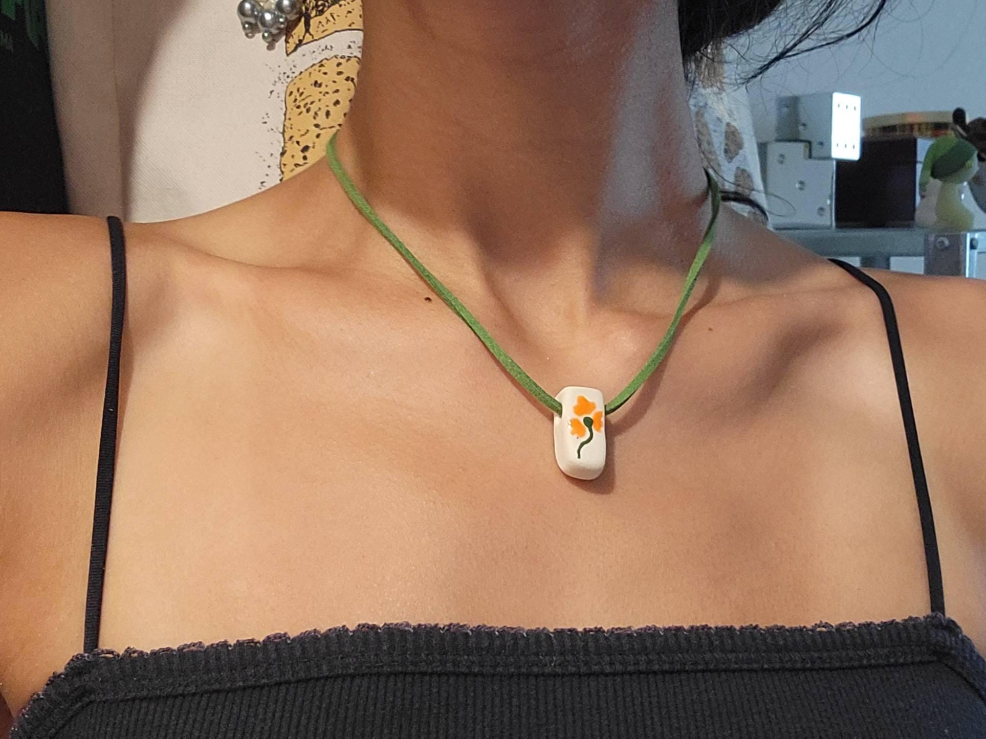 I fell in love with this necklace just from the photos, but it’s even more gorgeous in person! It has such a fun charm to it, kind of like a Mahjong tile :) I was expecting one colorful cord and one black, but I was thrilled to receive two adorable colors instead, an orange cord and a green one (my favorite!). Such a sweet surprise. Shipping was unbelievably fast too!!!
